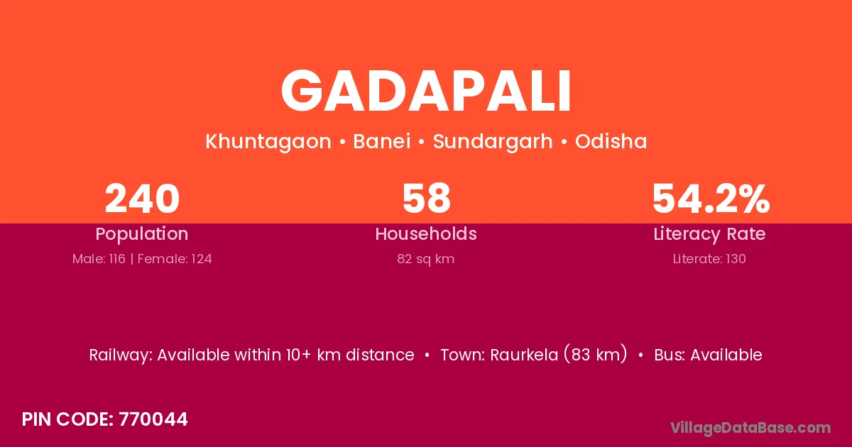 The literacy rate of Gadapali village is 59.61%. Male literacy stands at 69.77% and female literacy at 48.48%.