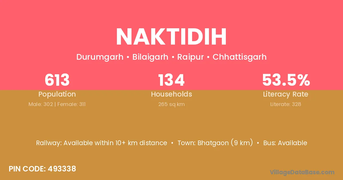 Naktidih village has a total population of 613 people, of which 302 are males and 311 are females.