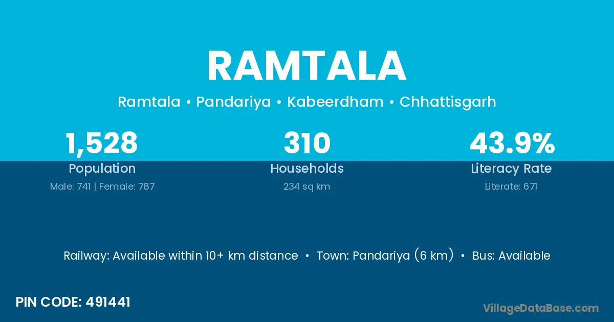 Ramtala village has a total population of 1,057 people, of which 528 are males and 529 are females.