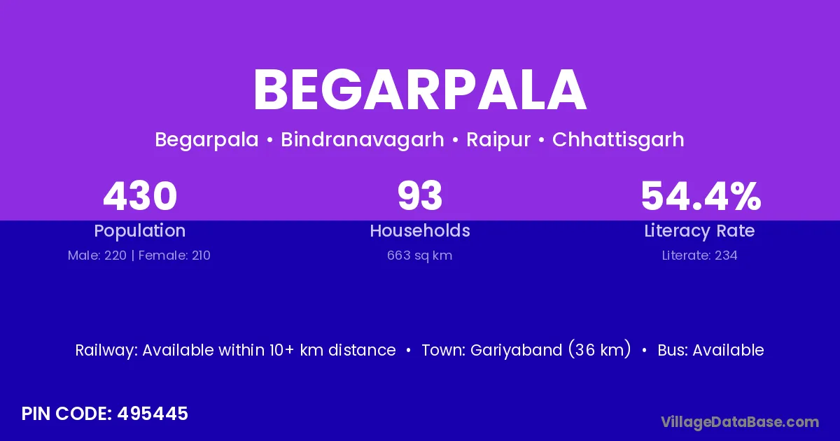 Gariyaband (36 km) is the nearest town to Begarpala village for major economic activities and is located approximately 36 km away.