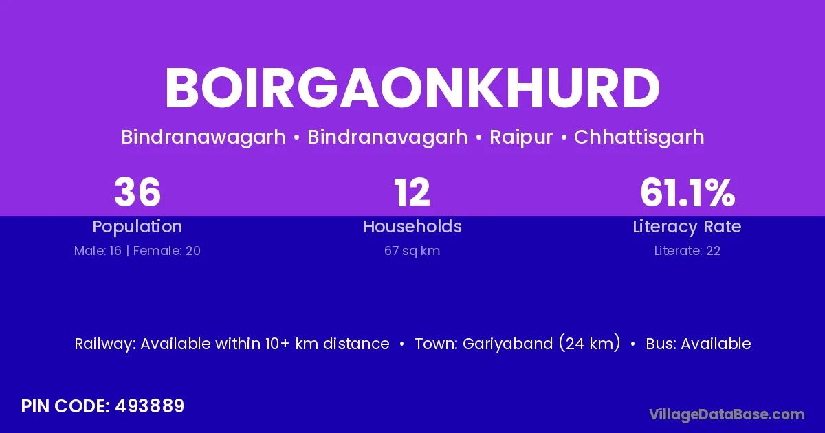 Gariyaband (24 km) is the nearest town to Boirgaonkhurd village for major economic activities and is located approximately 24 km away.