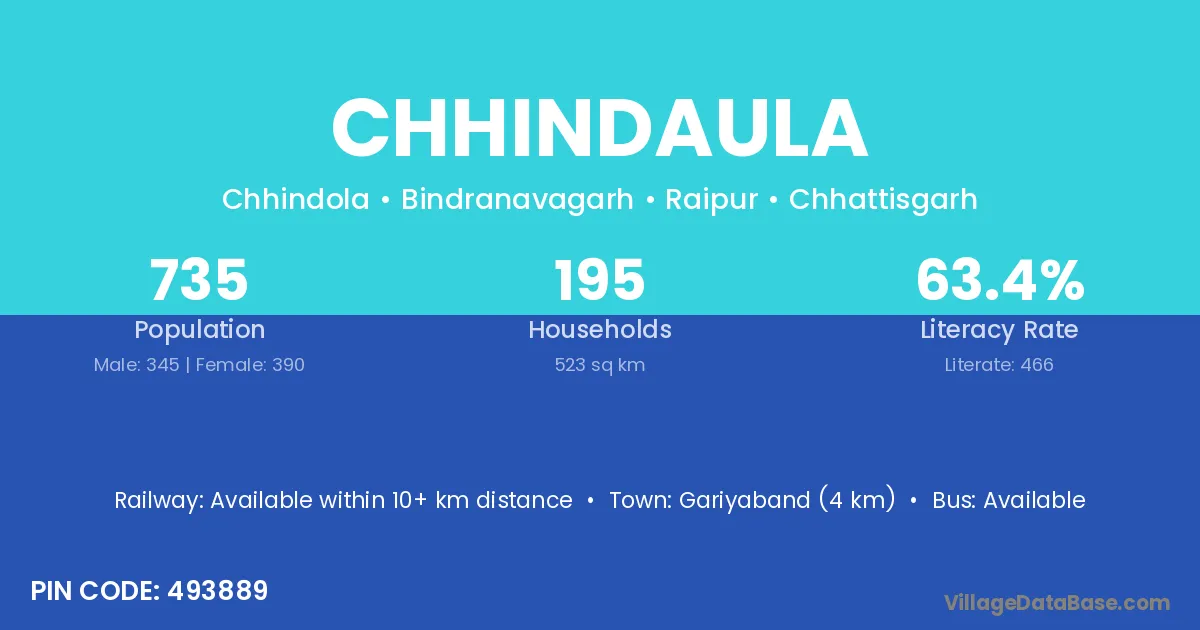 Gariyaband (4 km) is the nearest town to Chhindaula village for major economic activities and is located approximately 4 km away.