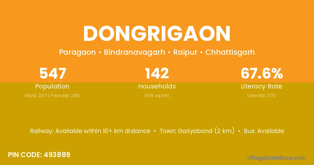 Gariyaband (2 km) is the nearest town to Dongrigaon village for major economic activities and is located approximately 2 km away.