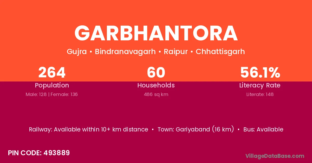 Gariyaband (16 km) is the nearest town to Garbhantora village for major economic activities and is located approximately 16 km away.