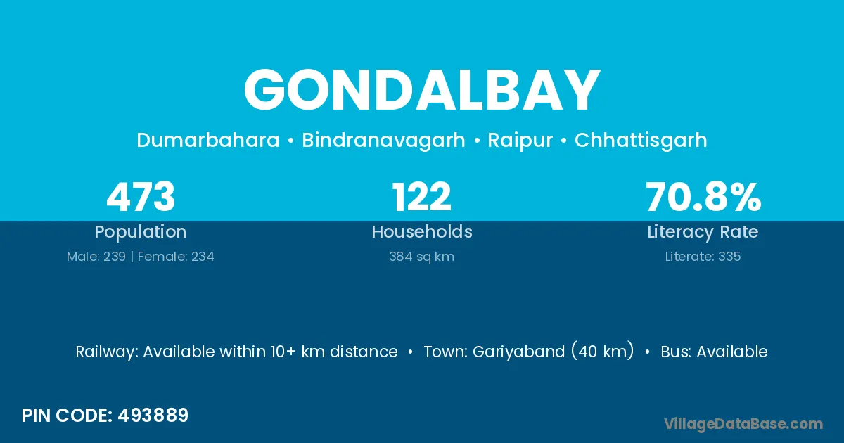 Gariyaband (40 km) is the nearest town to Gondalbay village for major economic activities and is located approximately 40 km away.
