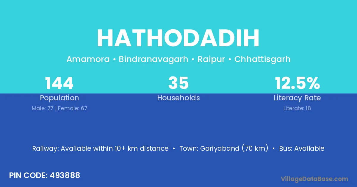 Gariyaband (70 km) is the nearest town to Hathodadih village for major economic activities and is located approximately 70 km away.