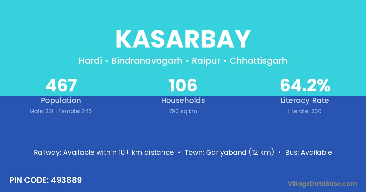 Gariyaband (12 km) is the nearest town to Kasarbay village for major economic activities and is located approximately 12 km away.