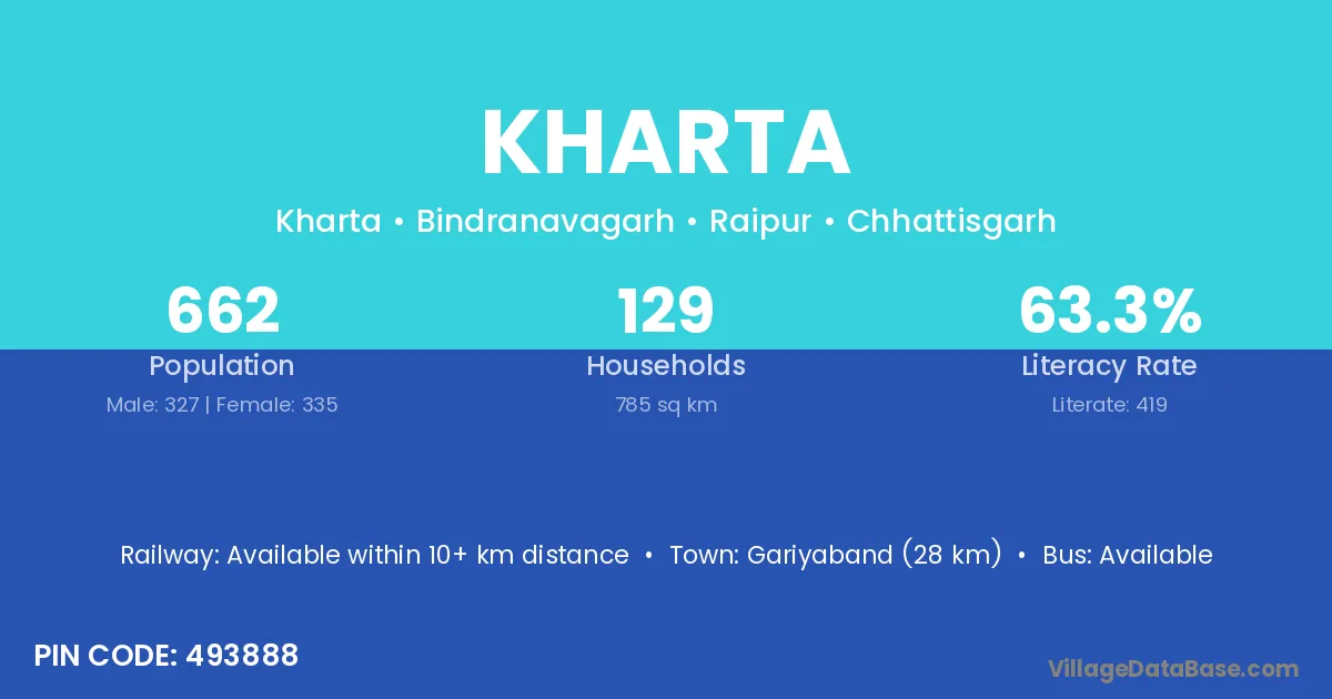 Gariyaband (28 km) is the nearest town to Kharta village for major economic activities and is located approximately 28 km away.