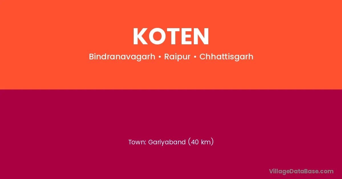 Gariyaband (40 km) is the nearest town to Koten village for major economic activities and is located approximately 40 km away.