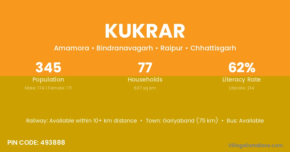 Gariyaband (75 km) is the nearest town to Kukrar village for major economic activities and is located approximately 75 km away.