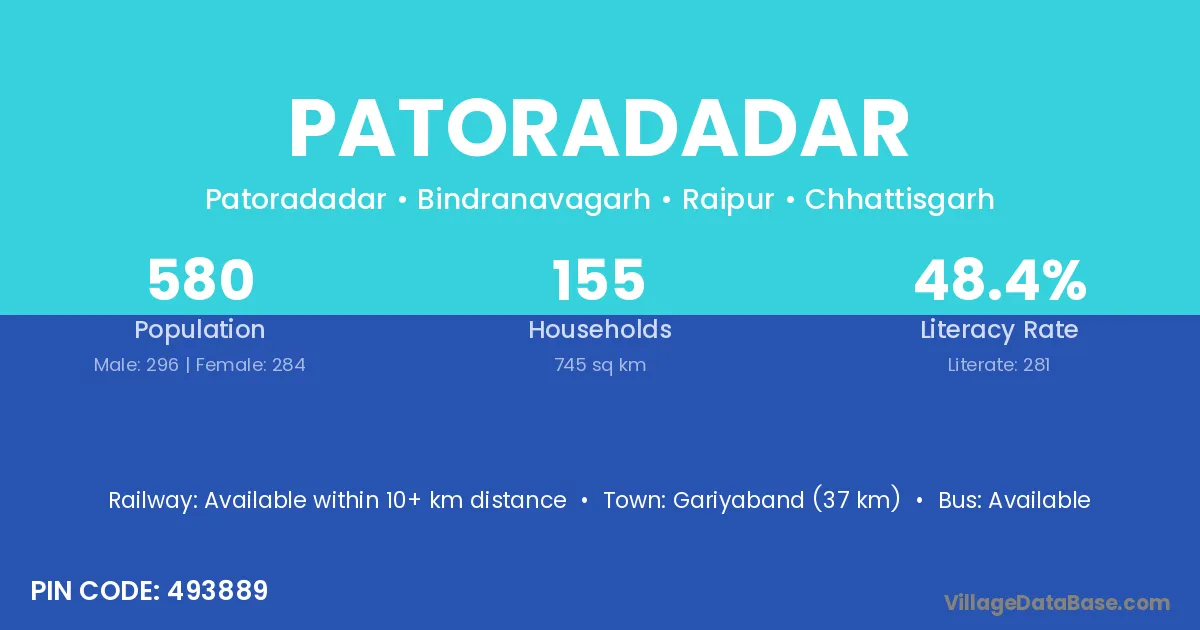 Gariyaband (37 km) is the nearest town to Patoradadar village for major economic activities and is located approximately 37 km away.