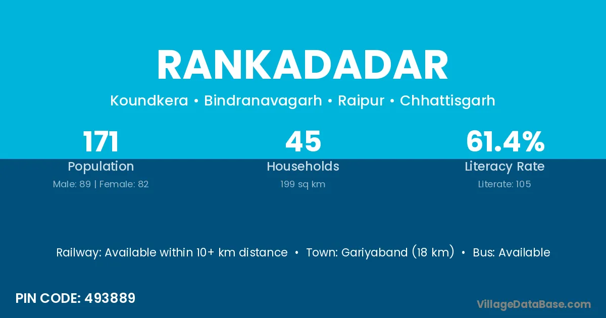 Gariyaband (18 km) is the nearest town to Rankadadar village for major economic activities and is located approximately 18 km away.