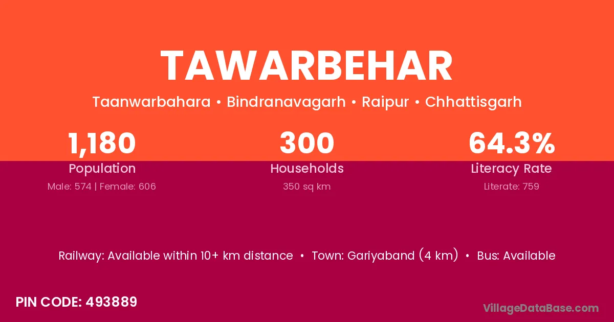 Gariyaband (4 km) is the nearest town to Tawarbehar village for major economic activities and is located approximately 4 km away.