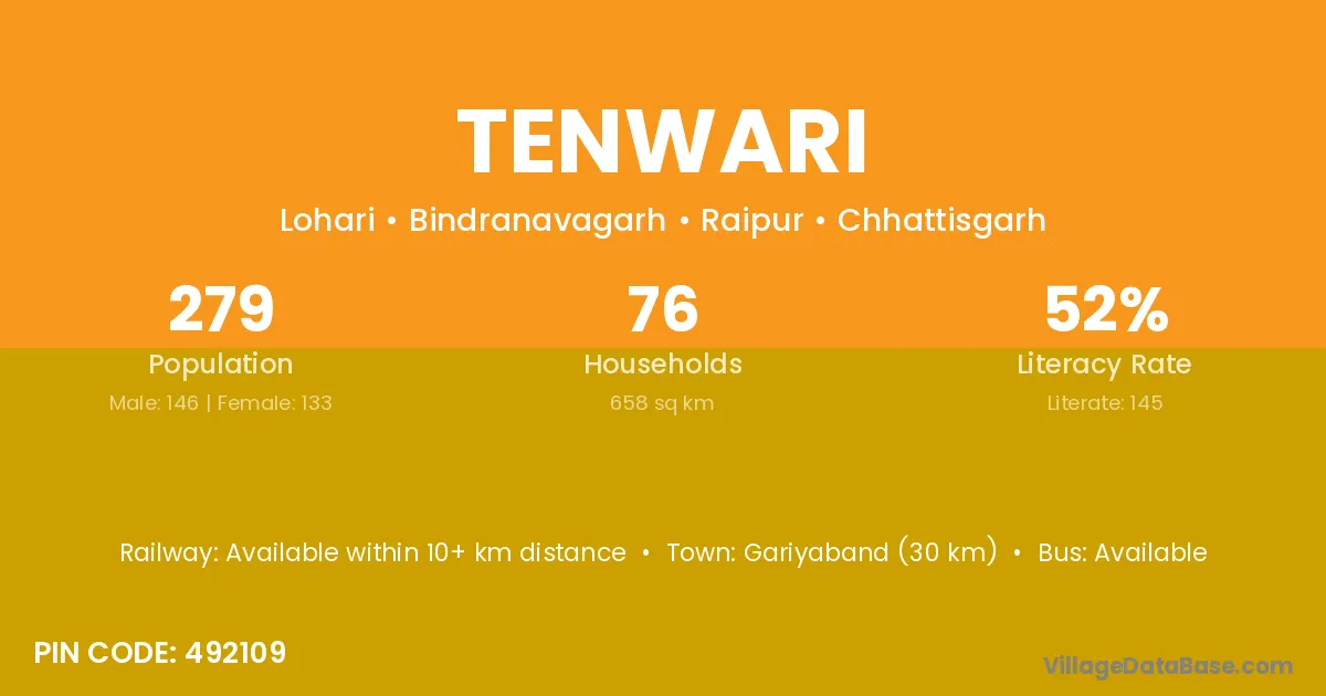Gariyaband (30 km) is the nearest town to Tenwari village for major economic activities and is located approximately 30 km away.