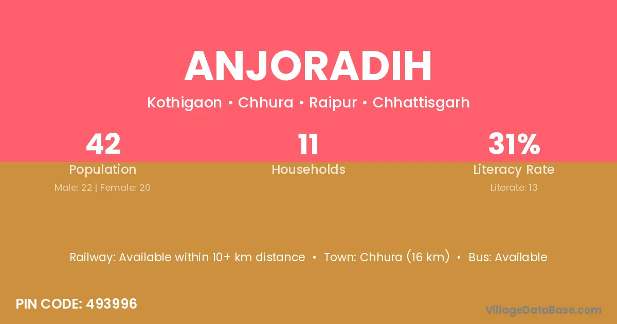 Anjoradih village has a total population of 42 people, of which 22 are males and 20 are females.