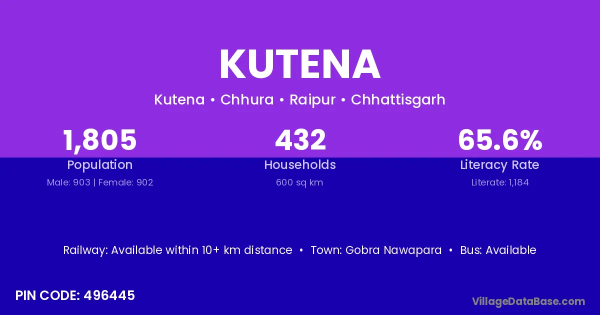 Kutena village has a total population of 1,805 people, of which 903 are males and 902 are females.