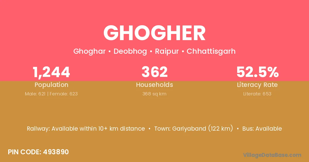 Gariyaband (122 km) is the nearest town to Ghogher village for major economic activities and is located approximately 122 km away.