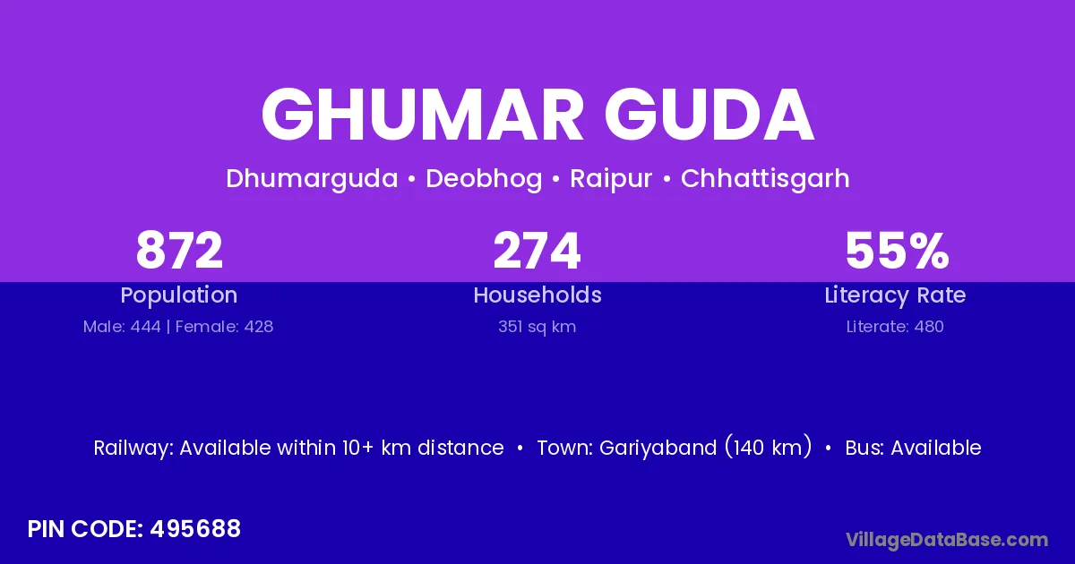 Ghumar Guda village has a total population of 872 people, of which 444 are males and 428 are females.