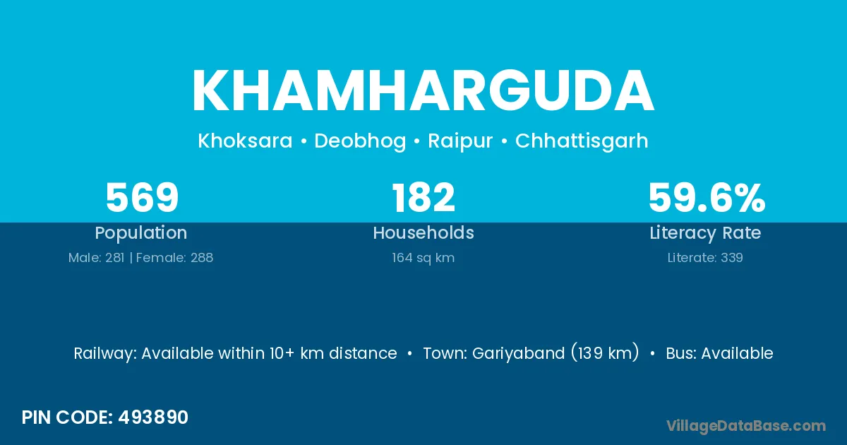 Gariyaband (139 km) is the nearest town to Khamharguda village for major economic activities and is located approximately 139 km away.