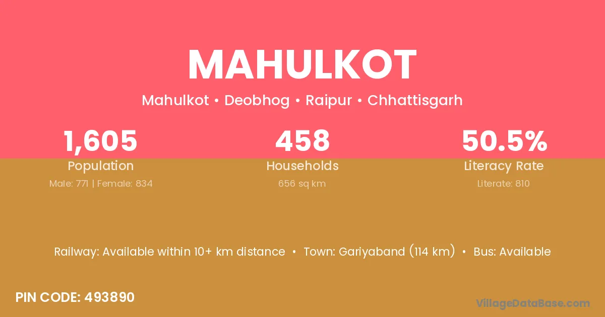 Gariyaband (114 km) is the nearest town to Mahulkot village for major economic activities and is located approximately 114 km away.