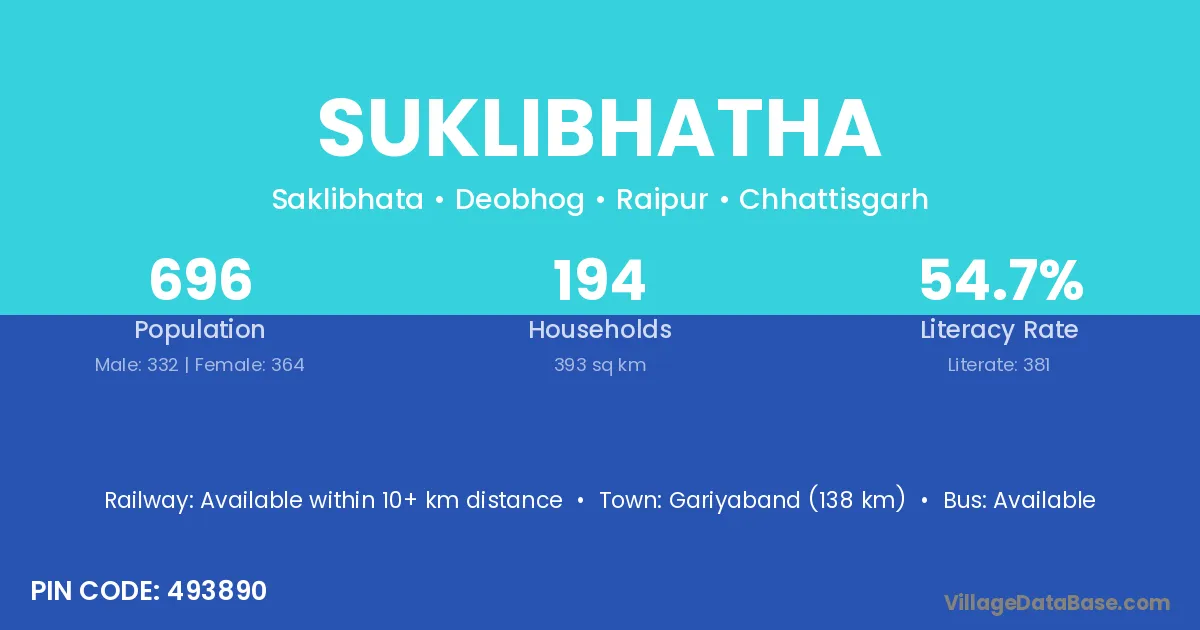 Gariyaband (138 km) is the nearest town to Suklibhatha village for major economic activities and is located approximately 138 km away.
