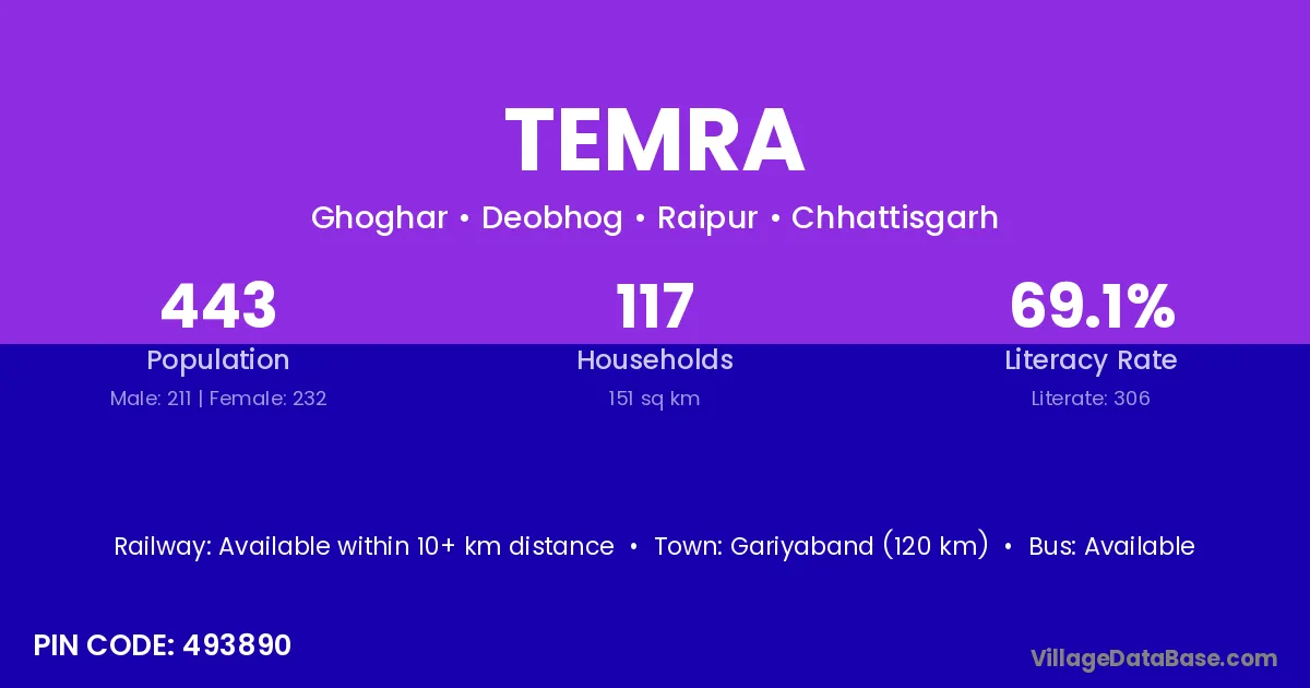 Gariyaband (120 km) is the nearest town to Temra village for major economic activities and is located approximately 120 km away.