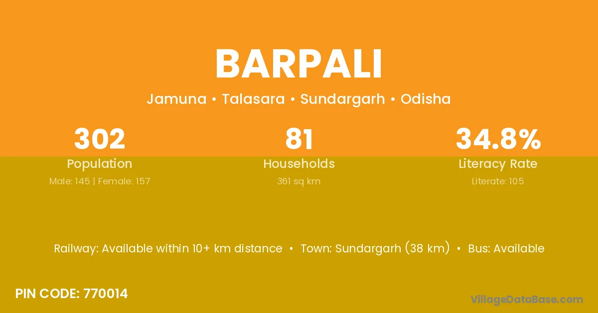 The literacy rate of Barpali village is 72.86%. Male literacy stands at 81.03% and female literacy at 64.11%.