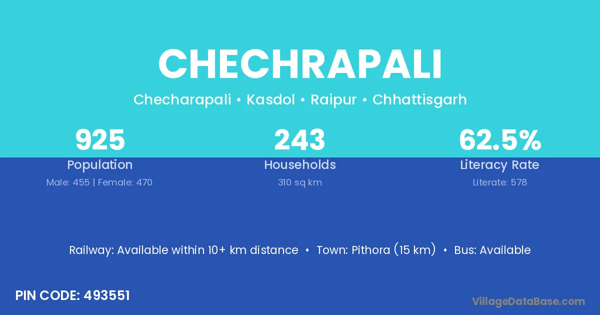 Pithora (15 km) is the nearest town to Chechrapali village for major economic activities and is located approximately 15 km away.
