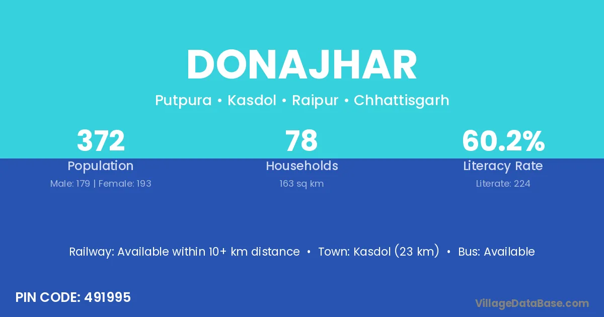 Kasdol (23 km) is the nearest town to Donajhar village for major economic activities and is located approximately 23 km away.