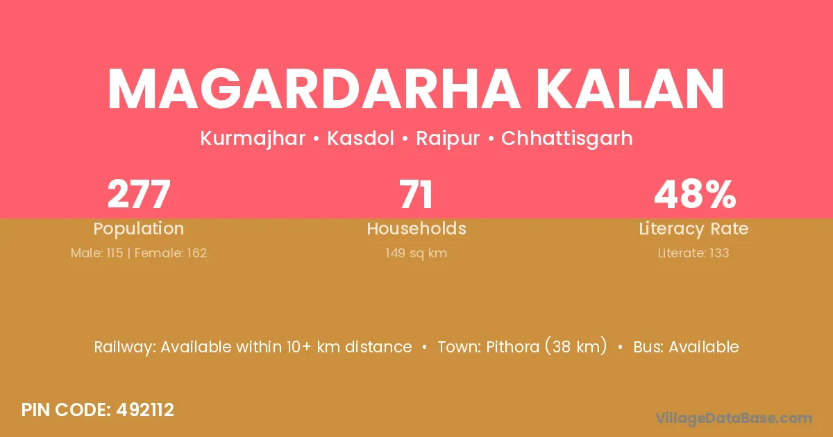 Pithora (38 km) is the nearest town to Magardarha Kalan village for major economic activities and is located approximately 38 km away.
