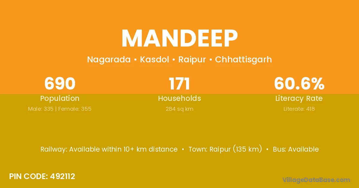 Raipur (135 km) is the nearest town to Mandeep village for major economic activities and is located approximately 135 km away.