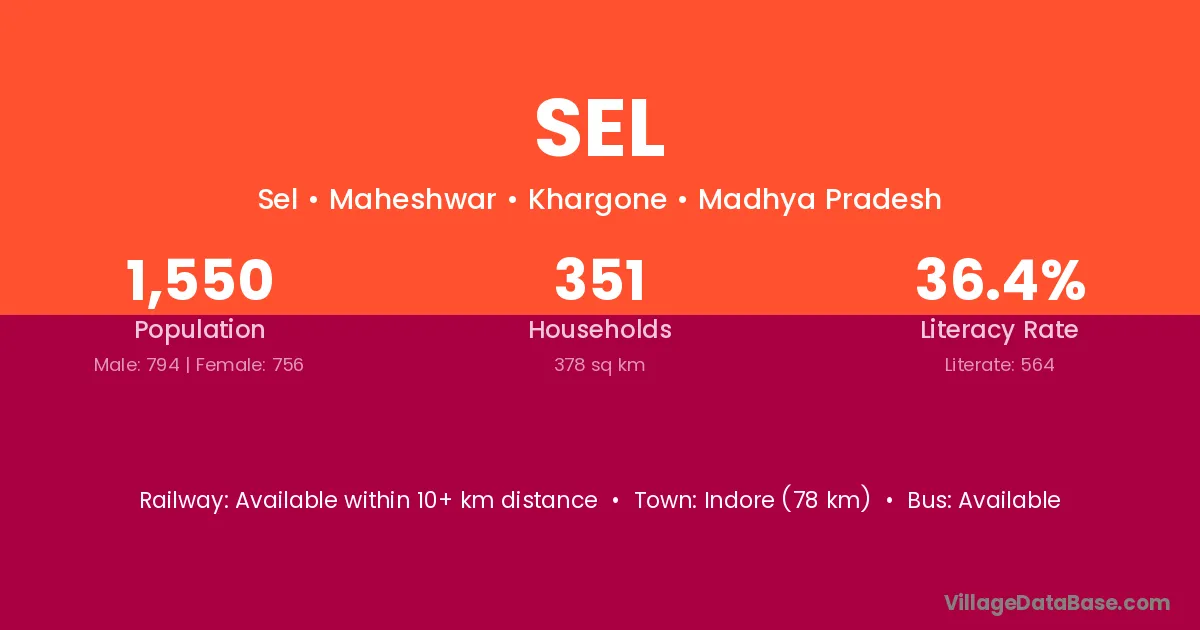 The literacy rate of Sel village is 64.52%. Male literacy stands at 73.68% and female literacy at 54.95%.