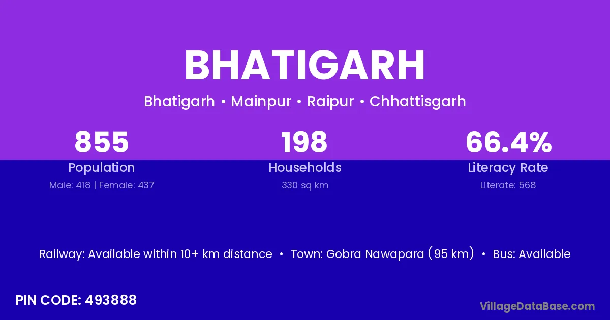 According to Census 2011 information, the village code of Bhatigarh village is 493888.