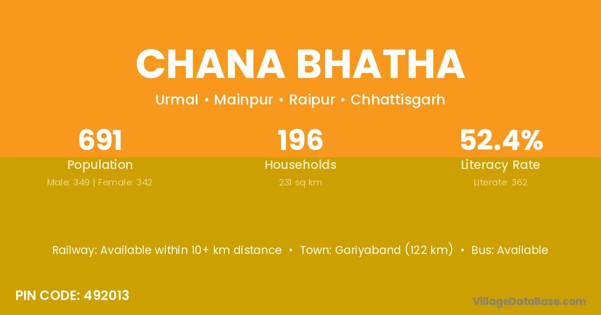 Gariyaband (122 km) is the nearest town to Chana Bhatha village for major economic activities and is located approximately 122 km away.