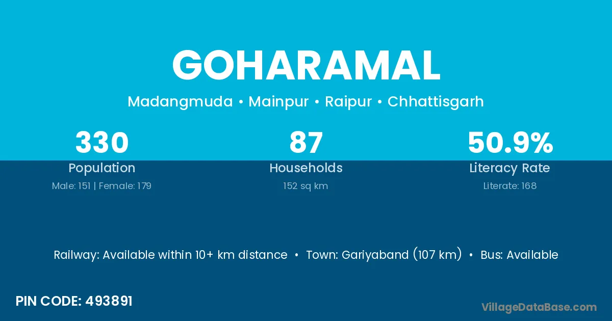 Gariyaband (107 km) is the nearest town to Goharamal village for major economic activities and is located approximately 107 km away.