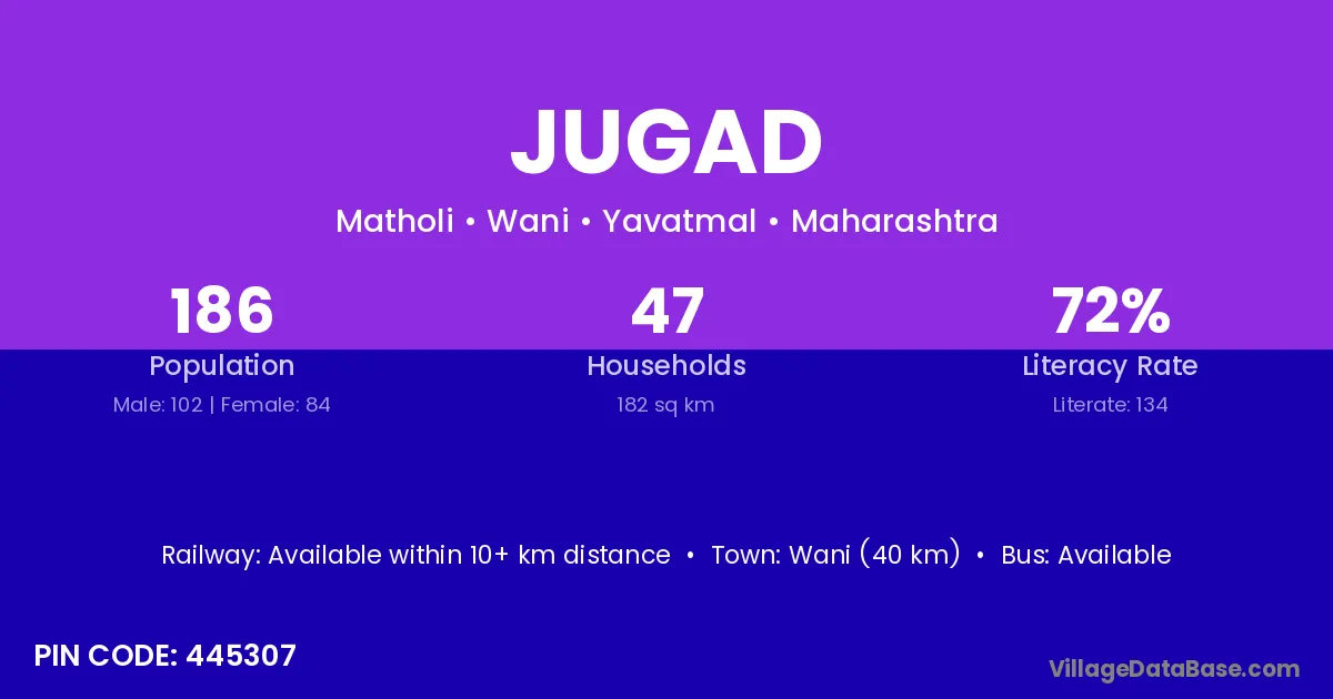 Jugad village has a total population of 386 people, of which 189 are males and 197 are females.