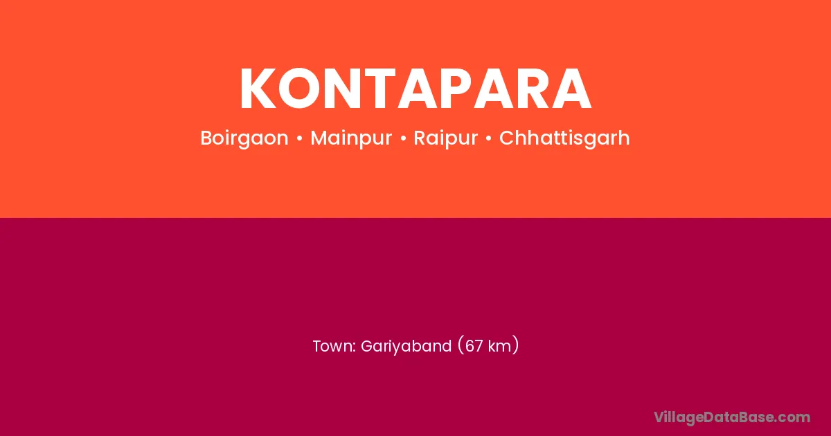 Gariyaband (67 km) is the nearest town to Kontapara village for major economic activities and is located approximately 67 km away.