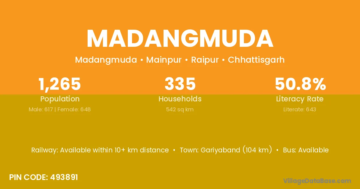 Gariyaband (104 km) is the nearest town to Madangmuda village for major economic activities and is located approximately 104 km away.
