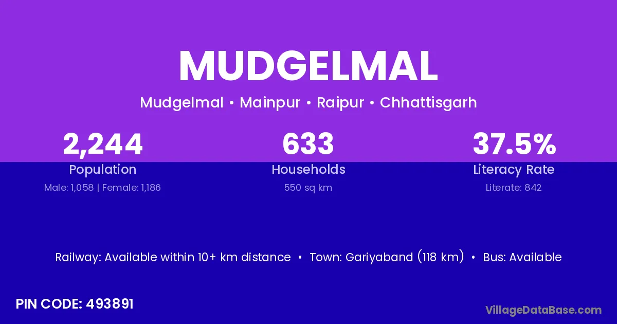 Gariyaband (118 km) is the nearest town to Mudgelmal village for major economic activities and is located approximately 118 km away.