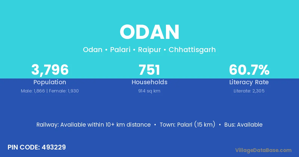 Palari (15 km) is the nearest town to Odan village for major economic activities and is located approximately 15 km away.