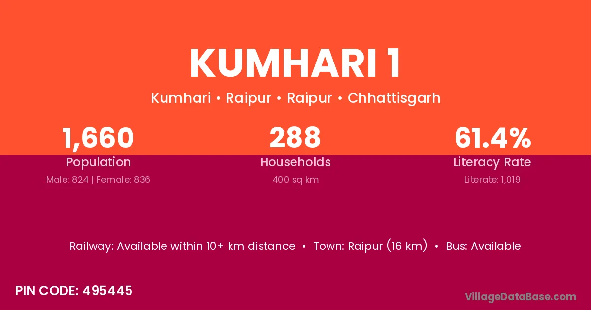 Kumhari 1 village has a total population of 1,660 people, of which 824 are males and 836 are females.