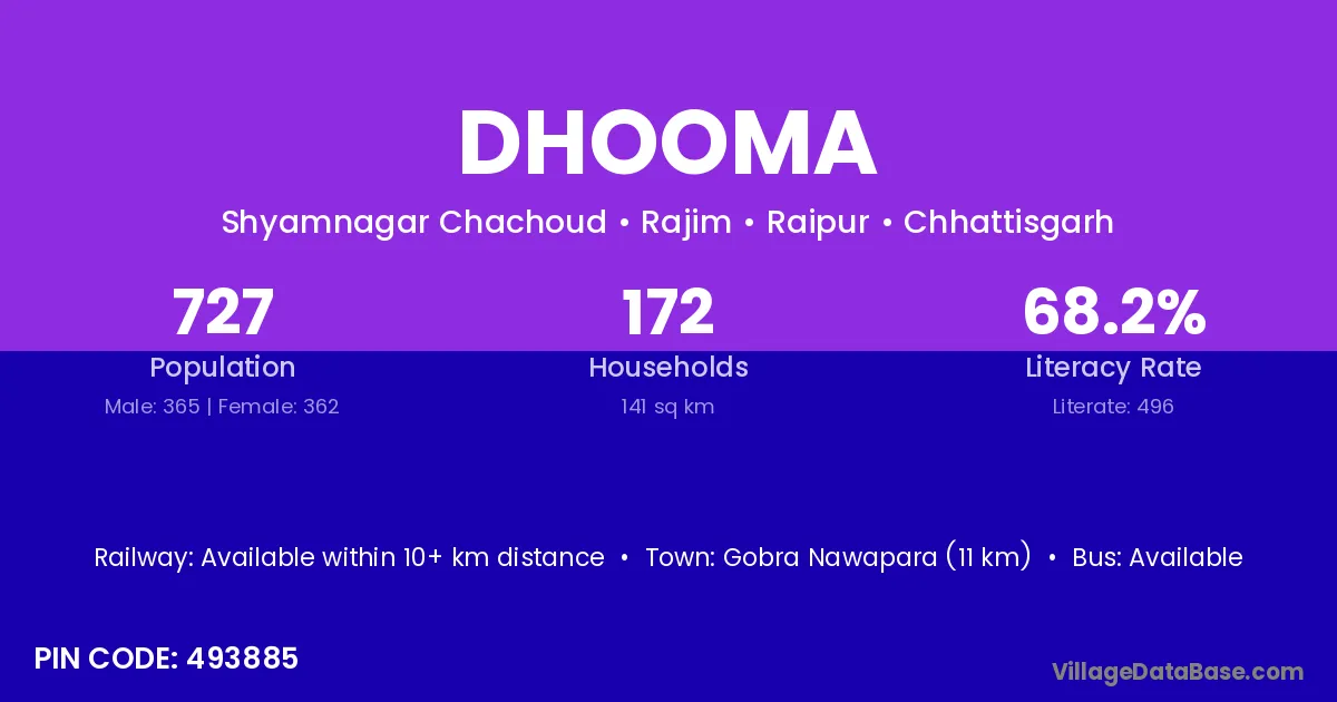 Gobra Nawapara (11 km) is the nearest town to Dhooma village for major economic activities and is located approximately 11 km away.