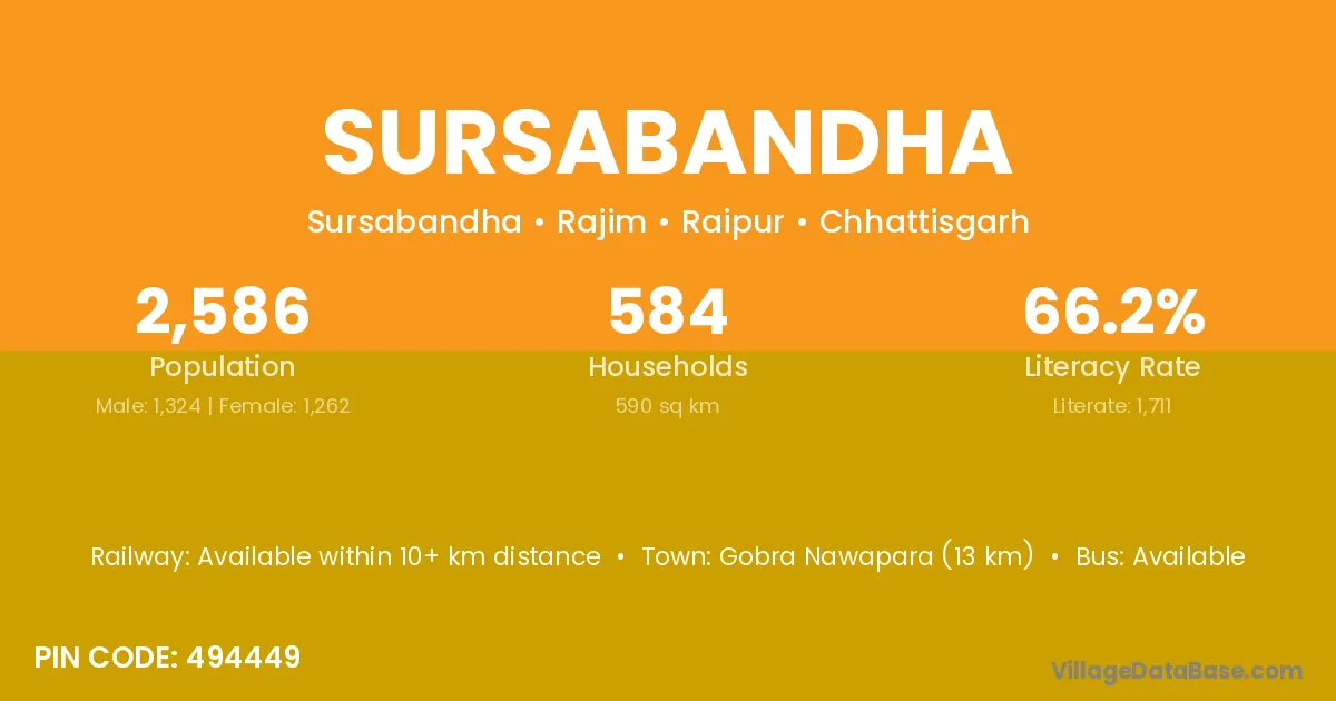 Gobra Nawapara (13 km) is the nearest town to Sursabandha village for major economic activities and is located approximately 13 km away.