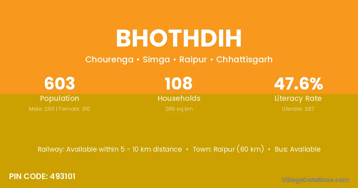 Raipur (60 km) is the nearest town to Bhothdih village for major economic activities and is located approximately 60 km away.