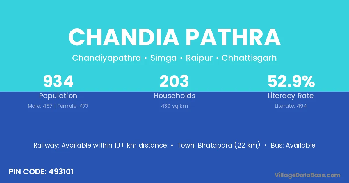Bhatapara (22 km) is the nearest town to Chandia Pathra village for major economic activities and is located approximately 22 km away.