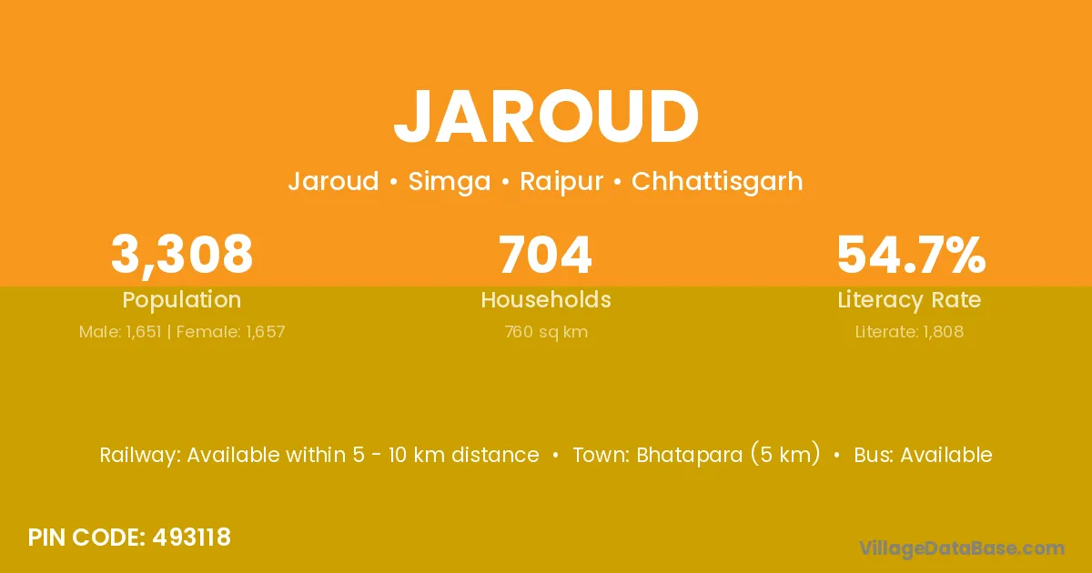 Bhatapara (5 km) is the nearest town to Jaroud village for major economic activities and is located approximately 5 km away.