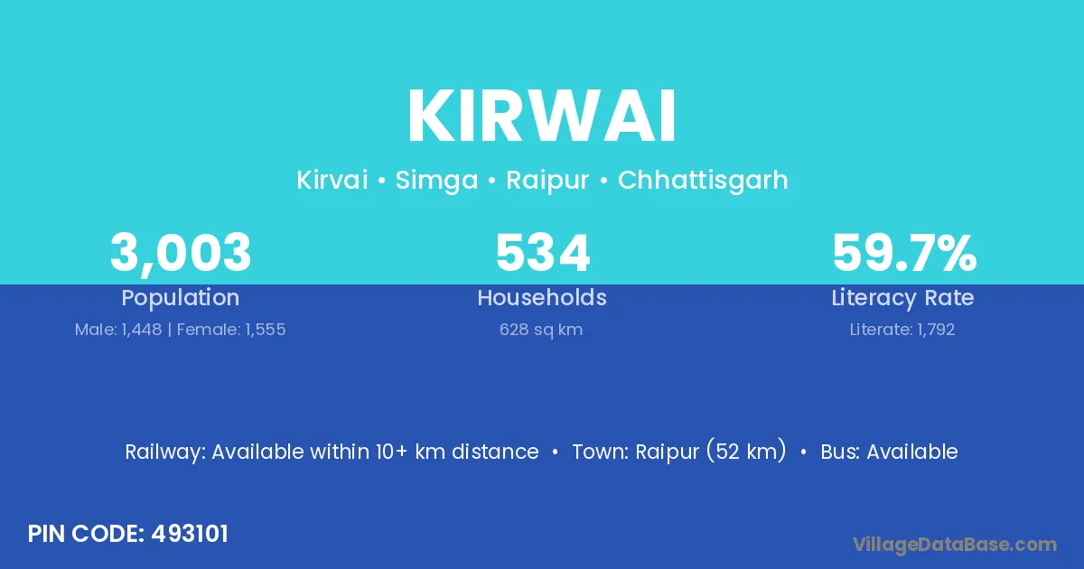 Raipur (52 km) is the nearest town to Kirwai village for major economic activities and is located approximately 52 km away.