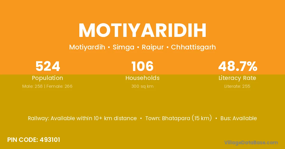 Bhatapara (15 km) is the nearest town to Motiyaridih village for major economic activities and is located approximately 15 km away.