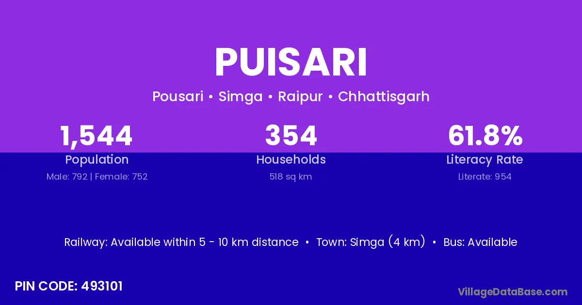 Simga (4 km) is the nearest town to Puisari village for major economic activities and is located approximately 4 km away.