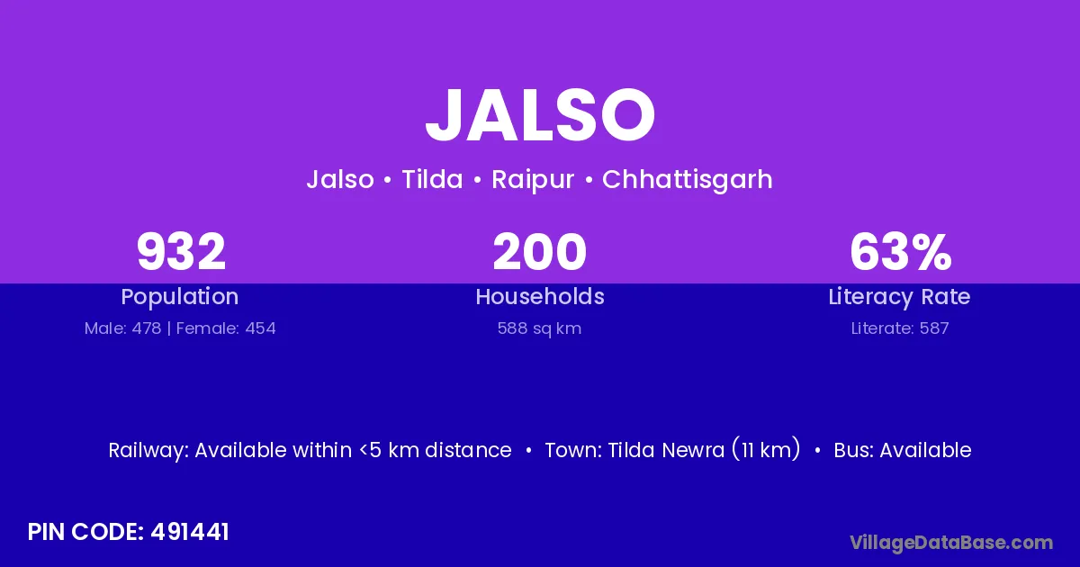Tilda Newra (11 km) is the nearest town to Jalso village for major economic activities and is located approximately 11 km away.